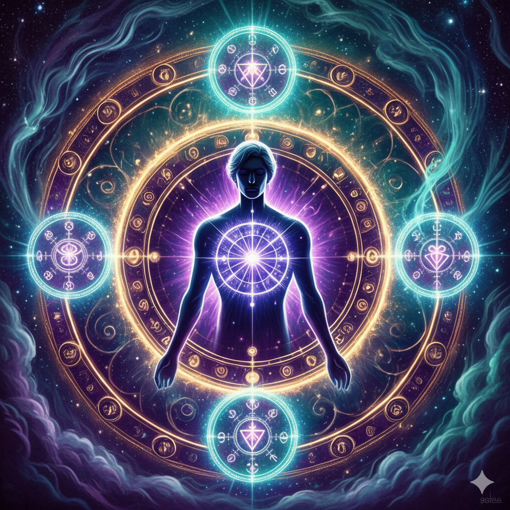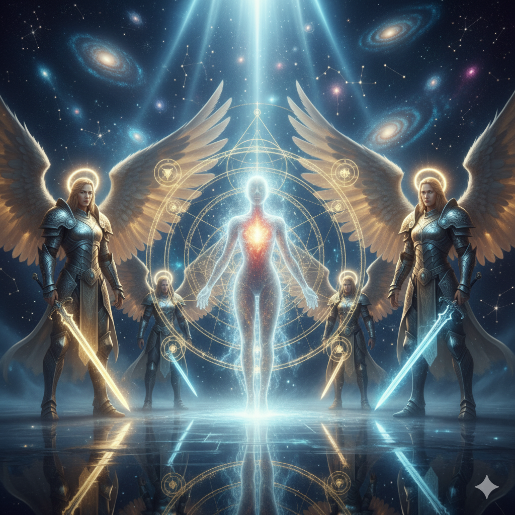 Um diagrama simbólico inspirado na radiestesia, que utiliza a energia dos nove arcanjos para criar uma barreira de proteção contra energias negativas, inveja, roubos e vibrações prejudiciais. Este gráfico pode ser aplicado para proteger pessoas, animais, bens materiais e ambientes, funcionando no dia a dia — em casa, no trabalho, no carro ou até como talismã pessoal, trazendo segurança e equilíbrio simbólicos.