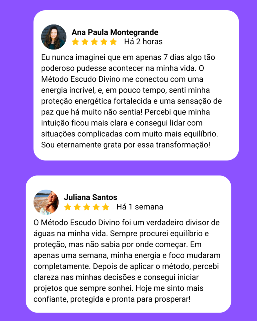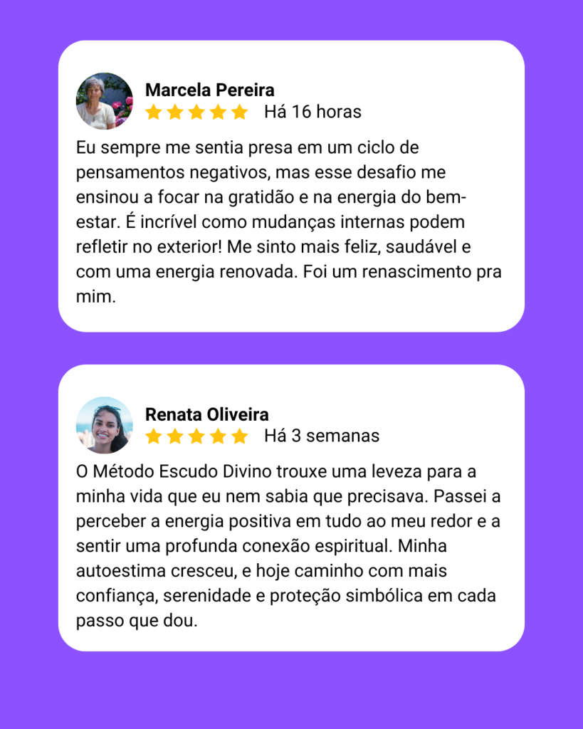 Você vai aprender a ativar o Método Escudo Divino com um simples comando, sem precisar usar velas, cristais ou qualquer elemento físico. Com essa prática, a proteção se torna instantânea e acessível em qualquer lugar, fortalecendo sua energia de forma simbólica e poderosa.